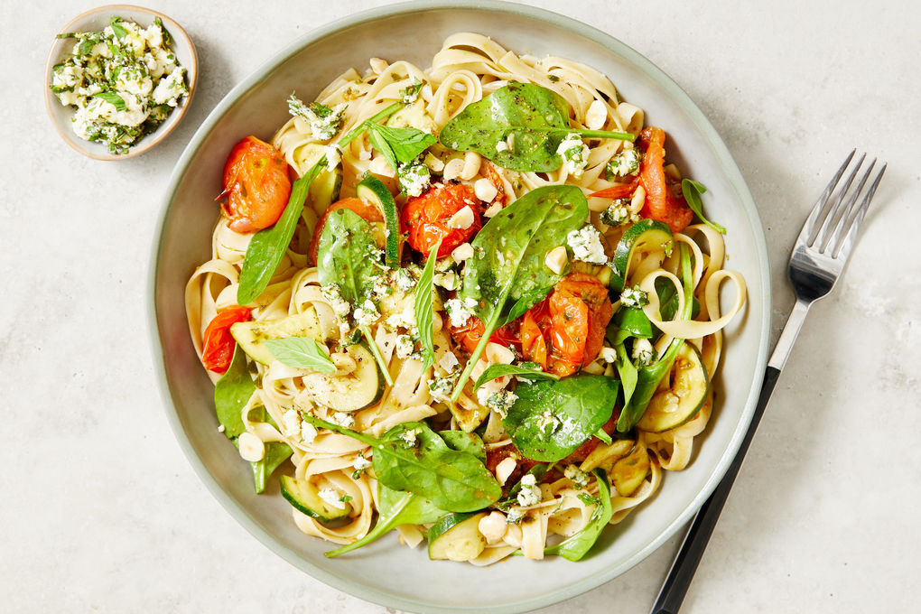 Pesto, feta cheese, sun-dried tomatoes, Mediterranean spices